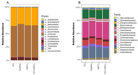 Comparison of the relative abundance at the (A.) Phylum (B.) Family levels among the different groups included. Abbreviations: T1DM = Type 1 Diabetes; CD = Coeliac disease; p = phylum; f = family.