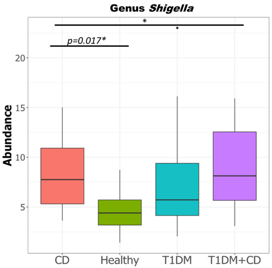 Difference in relative abundance of genus Shigella in the four study groups CD, T1DM, healthy control, T1DM+CD. (Kruskal-Wallis test with false discovery rate (FDR)-Bonferroni corrected p values. * p ≤ 0.05). Significant difference was observed across the four groups as well as between CD and healthy controls. Abbreviations: T1DM = Type 1 Diabetes; CD = Coeliac disease.