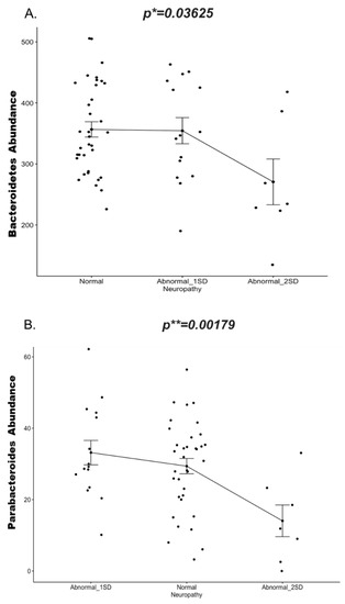 Knowing that neuropathy is a known complication associated with T1DM and CD, and that a possible bidirectional crosstalk linking the gut microbiota with the nervous system has been previously described [22], we wanted to test whether the gut microbes identified in this study were correlated with corneal neuropathy. We have shown that CCM demonstrates evidence of neuropathy in these children with T1DM [38] and to a lesser extent in those with CD [39]. We performed a linear regression to determine any possible association between the abundance of the gut microbiota and abnormal corneal nerve fiber length (CNFL) (Supplementary Figure S8). Our data showed that Bacteroidetes phylum (Figure 6A) specifically Parabacteroides genus (Figure 6B) was negatively correlated with CNFL, (p = 0.03625 and 0.00179 respectively). Vitamins D and B have been previously reported to play a potential role in the pathophysiology of neuropathies [45,46,47,48], however in our cohort we did not observed a significant correlation between these biochemical markers and neuropathy (Supplementary Figure S9).