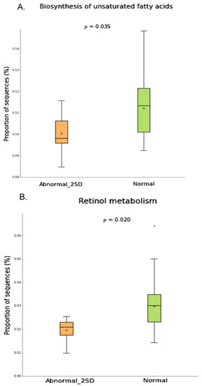 Inferred gut microbiome functions by PICRUSt from 16S rRNA gene sequences in neuropathy(2SD) compared to normal group. Difference in predicted functions of genes involved in (A.) biosynthesis of unsaturated fatty acids (B.) Retinol metabolism. (Mann-Whitney* p < 0.05;). Abbreviations: SD = Standard deviation.