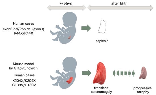 Of particular importance, absence or hypoplasia of the spleen seems to be the hallmark of the illness, at least for the first 6 cases. Absence of the spleen seemed to be a specific finding for the first 6 HO-1-deficient cases and Case 9, but was not the case in Cases 7 and 8. Why these two cases showed a normal-sized spleen or splenomegaly, respectively, remains unclear. In this regard, a report by Kovtunovych et al. showed HO-1 mutation in mice resulting in progressive atrophy of the spleen due to fibrotic changes in the splenic artery with age, providing food for thought [