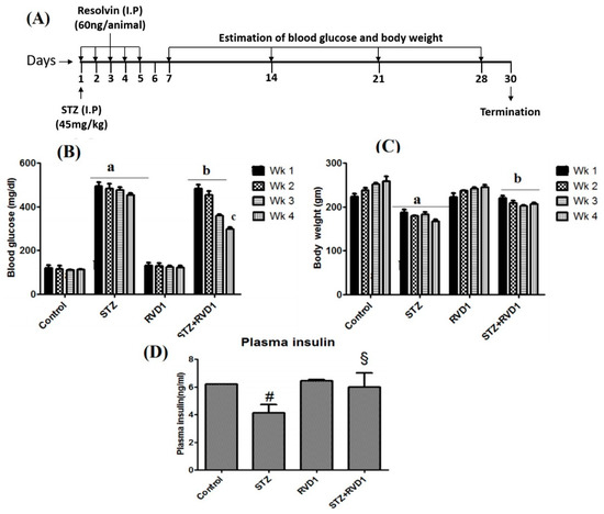 2.1. Effect of RVD1 Treatment on Plasma Glucose and Body Weight in STZ Induced T1DM