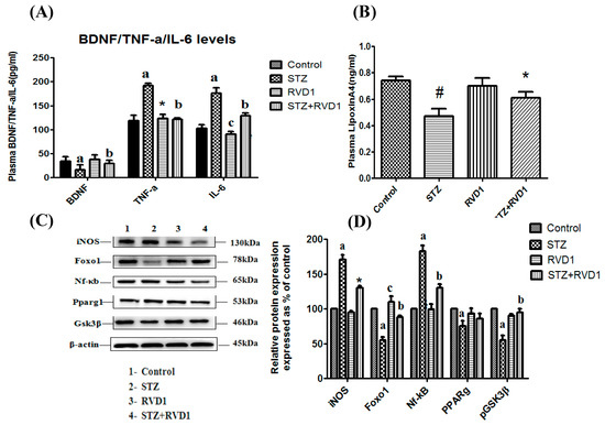2.6. Effect of RVD1 on STZ-Induced Changes in p65Nf-kB, PPPAR-γ, iNOS, Foxo 1, Gsk3β Proteins in the Pancreatic Tissue