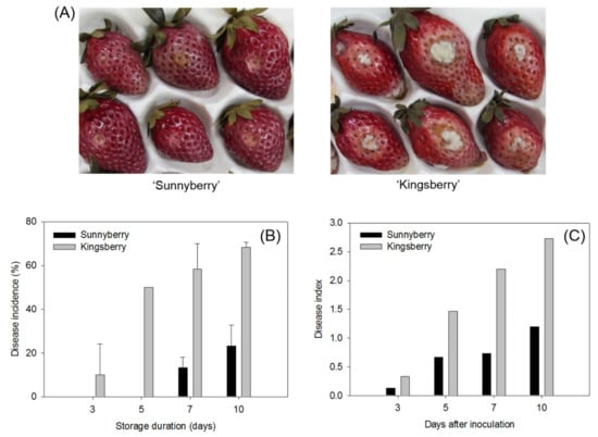 “Sunnyberry” and “Kingsberry” strawberry fruit inoculated with Botrytis cinerea. (A) Fruit at 10 d post-inoculation. (B) Disease incidence during 10 d storage at 10 °C in the absence of B. cinerea inoculation. (C) Disease index during 10 d storage at 25 °C post-inoculation. Data are means ± SD.