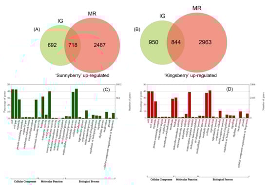 Transcriptomes of “Kingsberry” and “Sunnyberry” strawberry fruit. (A) Upregulated DEGs in “Sunnyberry” at IG and MR. (B) Upregulated DEGs in “Kingsberry” at IG and MR. GO annotation of DEGs at IG (C) and MR (D). DEGs were filtered using the false discovery rate (FDR) criteria p < 0.01 and |Fold change| > 2. DEGs, differentially expressed genes; GO, gene ontology; IG, immature-green; MR, mature-red.