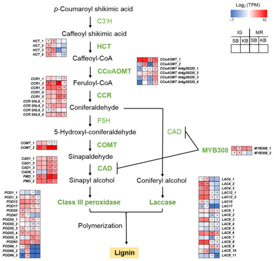 Here, we identified DEGs involved in lignin biosynthesis (Figure 3; Table S3). At both IG and MR, caffeic acid O-methyltransferase, cinnamoyl-CoA reductase 1 (CCR1), and cinnamyl alcohol dehydrogenase (CAD) genes were upregulated in “Sunnyberry” compared with those in “Kingsberry”. In contrast, at IG and MR, caffeoyl-CoA O-methyltransferase genes were upregulated in “Kingsberry” relative to “Sunnyberry”. Certain CAD genes were annotated as putative mannitol dehydrogenases. Nevertheless, these genes may be functionally redundant and could be considered CAD [27]. Class III peroxidases (PODs) and laccases (LACs) polymerize monolignol units into lignin. At MR, most DEGs annotated as POD and LAC were upregulated in “Sunnyberry” compared with those in “Kingsberry”.
