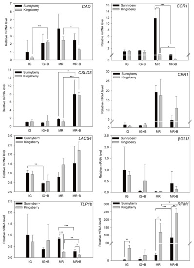 In both cultivars, CAD was upregulated after B. cinerea inoculation only at IG while cellulose synthase-like protein D3 (CSLD3) was upregulated after B. cinerea inoculation only at MR. At MR, CCR1 was relatively upregulated in “Sunnyberry”. However, B. cinerea inoculation dramatically lowered CCR1 mRNA in both cultivars at MR.