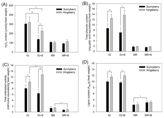 Changes in the physiological properties of “Sunnyberry” and “Kingsberry” strawberry. (A) H2O2 content, (B) total phenolic content, (C) total antioxidant activity, and (D) lignin content. IG, immature-green fruit without inoculation; IG + B, immature-green fruit at 5 d after inoculation; MR, mature-red fruit without inoculation; MR + B, mature-red fruit at 10 d after inoculation. Data are means ± SD for four biological replicates. Asterisks indicate statistically significant differences between cultivars. *, p < 0.05; **, p < 0.01.
