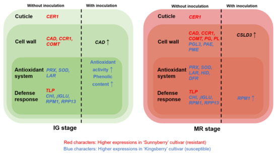 Figure 7 summarizes the differences between “Sunnyberry” and “Kingsberry” strawberry fruit in terms of gene expression at IG and MR and in the presence and absence of B. cinerea inoculation. Genes in red font were expressed at relatively higher levels at IG, while genes in blue font were expressed at relatively higher levels at MR.