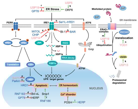 The functional roles of E3 ubiquitin ligases (blue) and DUBs (pink) in the ER stress and ERAD signaling pathway. Once the unfolded protein is overloaded, the three signaling sensor proteins PERK (blue), IRE1 (green), and ATF6 (orange) that reside on the ER membrane are activated, and the activated PERK phosphorylates the eukaryotic translation initiation factor 2α (eIF2α), inhibiting global translation, reducing ER protein-load while also increasing transcription factor ATF4. Activated IRE1 triggers XBP1 mRNA splicing to initiate the synthesis of the transcription factor XBP1. It also enhances mRNA degradation, reduces the total protein content of the ER, and activates JNK and other cellular pathways. ATF6 is translocated into Golgi in response to ER stress and is cleaved to release the transcription factor ATF6f. These transcription factors, in turn, initiate a cascade of signals that relieve ER stress and restore homeostasis or induce cell death pathways. At the same time, the misfolded protein is reverse-transported to the cytoplasm with the assistance of the ERAD complex and the P97/VCP (valosin-containing protein) complex to complete the proteasome degradation. (a) The ubiquitination of IRE1α by mitochondrial ubiquitin ligase (MITOL) and carboxy-terminus of Hsc70-interacting protein (CHIP) inhibits its kinase activity, allowing for the suppression of ER stress. (b) BI-1 can interact with IRE1α and regulate its endonuclease activity. However, BI-1 is degraded by ubiquitination by bifunctional apoptosis regulator (BAR), leading to the release of the inhibitory effect of IRE1α, thereby promoting ER stress. (c) CHOP is violently induced when ER stress occurs, and overexpression of CHOP can lead to cell apoptosis. CHOP is ubiquitinated by Parkin to promote its degradation, which prevents ER stress-induced cell death. (d) Bcl-xL is an antiapoptotic protein and belongs to one of the Bcl-2 family members. RNF183 protein increases during ER stress occurs and ubiquitinates Bcl-xL to promote its degradation, leading to increased ER stress-induced apoptosis. (e) HERP (homocysteine-induced endoplasmic reticulum protein) is a negative regulator of ER stress, and it can protect cells from apoptosis mediated by ER stress. GP78 can interact with HERP, causing HERP to be ubiquitinated and degraded, thereby starting the process of ER stress recovery. (f) Bnip1 is a proapoptotic protein. RNF186 overexpression promotes Bnip1 ubiquitination and transfer to mitochondria but does not affect its protein level. Poly-ubiquitinated BNip1 amplifies RNF186-induced apoptosis signaling of ER stress. (g) HRD1 expression is upregulated by ER stress, and HRD1 rescues cells from ER stress-induced apoptosis. (h) Sel1L-HRD1 protein complex can recognize, ubiquitinate IRE1α, and mediate its degradation, restraining IRE1α signaling and reduces IRE1α-associated inflammation. (i) HERP also plays a vital role in maintaining calcium homeostasis during ER stress. POSH ubiquitinates HERP and promotes the redistribution of HERP from TGN to the ER, thereby regulating calcium homeostasis by increasing the level of HERP in the ER. (j) GP78 protects against ER stress in zebrafish liver, but the specific protective mechanism is not yet clear. (k) USP13 stabilizes UBL4A by deubiquitination, which is a functional component of ERAD, thus allowing proteasome degradation to proceed normally. (l) USP19 blocks the degradation of TCRa and other ERAD substrates through deubiquitination. (m) In addition, USP19 can deubiquitinate HRD1, which plays a key role in ERAD, and USP19 promotes ERAD by stabilizing HRD1. (n) YOD1 eliminates the Ub chains attached to substrates such as RI332 through deubiquitination and promotes the reverse translocation of substrates from the ER to the cytoplasm. (o) USP14 binds to IRE1 and inhibits its phosphorylation, thereby blocking IRE1-mediated cell death. (p) BAP1 directly binds to promoters of CHOP and inhibits the unfolded protein response (UPR) and associated apoptotic pathways by reducing its transcription. (q) ORP8 is a lipid transfer protein anchored to the ER, which can be deubiquitinated by USP5, causing disturbance of phospholipid transport and resulting in ER stress. (r) USP19 can inhibit the UPR and downregulate the expression of CHOP, but its specific target is unclear.