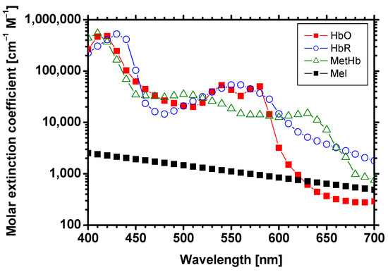 Extinction coefficient spectra of typical hemoglobin derivatives (oxygenated hemoglobin HbO10, deoxygenated hemoglobin HbR10, and methemoglobin11) and melanin12 in visible wavelength region between 400 and 700 nm.