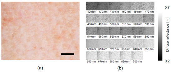 Typical results obtained from in vivo rat dorsal skin under normal conditions: (a) raw RGB image and (b) estimated images of spectral diffuse reflectance by Wiener estimation. A scale bar (black line in the RGB image) indicates 1.0 mm.