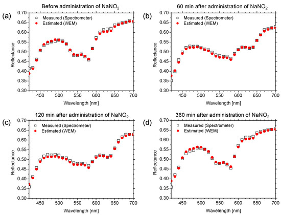 Comparisons of estimated reflectance spectra averaged over entire region of spectral images and reference spectra measured by spectrometer: (a) before administration of NaNO2, (b) 60 min after administration of NaNO2, (c) 120 min after administration of NaNO2, and (d) 360 min after administration of NaNO2.