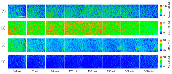 Typical sequential images of (a) CmetHb, (b) CHbT, (c) StO2, and (d) Cm obtained from rat dorsal skin before and after the administration of NaNO2 at dose of 50 mg/kg. A scale bar (white line in the CmetHb image for before) indicates 2.0 mm.