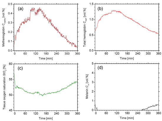 We examined the hemodynamic responses of rat dorsal skin after the administration of NaNO2. We observed the profound increase in CmetHb after the administration of NaNO2 and the subsequent decrease (Figure 4a and Figure 5a). The time course of CmetHb was indicative of temporary methemoglobinemia. We also observed that the value of CmetHb rapidly increased with a half-maximum time of less than 30 min, and the time required to return to the normal levels increased proportionally with the dose (Figure 6a). The dose-dependent change in CmetHb is compatible with previously reported results [57]. The value of StO2 dramatically dropped at 60 min after the administration of NaNO2, indicating temporary hypoxemia caused by methemoglobinemia, as expected (Figure 4c and Figure 5c). The time required to return to the normal StO2 levels increased proportionally with the dose (Figure 6c). The results for StO2 indicated that the proposed method can be used to evaluate peripheral hemoglobin oxygenation level during methemoglobinemia. The value of CHbT was remarkably increased after the administration of NaNO2 (Figure 4b, Figure 5b and Figure 6b). The profound increase in CHbT indicated an elevated cardiac output caused by tachycardia during methemoglobinemia [58] and the resultant increase in peripheral blood volume to compensate for the hypoxia and hypoxemia.