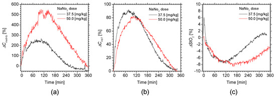 Time courses of (a) ΔCmetHb, (b) ΔCHbT, and (c) ΔStO2 ΔCm averaged over two rats for different doses of NaNO2.