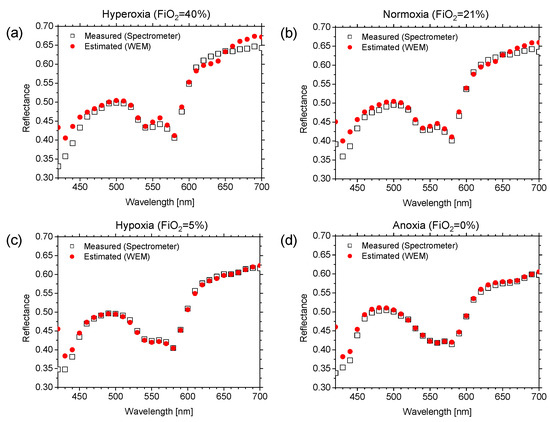 Comparisons of estimated reflectance spectra and reference spectra measured by spectrometer for (a) hyperoxia (FiO2 = 40%), (b) normoxia (FiO2 = 21%), (c) hypoxia (FiO2 = 5%), and (d) anoxia (FiO2 = 0%).