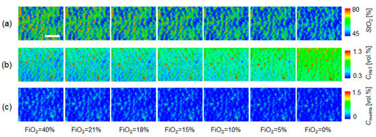 Typical sequential images of (a) StO2, (b) CHbT, and (c) CmetHb obtained from rat dorsal skin during changes in FiO2. A scale bar (white line in the StO2 image for FiO2 = 40%) indicates 2.0 mm.