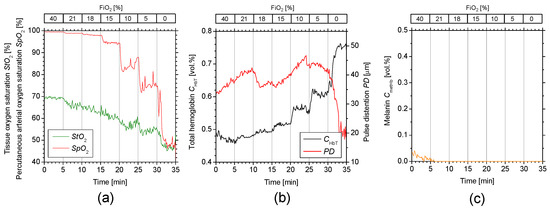 Typical time courses of (a) StO2, (b) CHbT, and (c) CmetHb averaged over entire region of each corresponding image shown in Figure 8. Time courses of SpO2 and PD were also compared with StO2 and CHbT, respectively.
