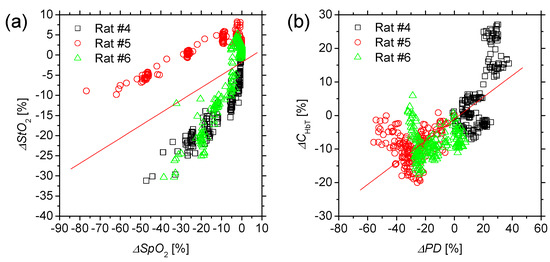 Scatter plots of (a) ΔSpO2 vs. ΔStO2 and (b) ΔCHbT vs. ΔPD obtained from three rats.