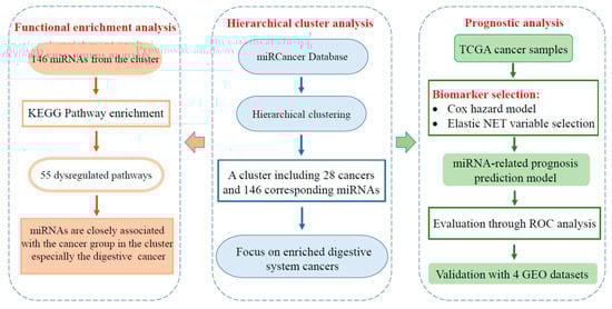 A flow chart of the study design. First, we utilized hierarchical clustering to identify clusters of cancers and associated miRNAs. In this study, we focused on the digestive system cancer enriched in the identified cluster. Furthermore, we conducted a functional enrichment analysis with cluster-associated miRNAs. Next, with data of tumor samples from The Cancer Genome Atlas (TCGA) datasets, miRNA signatures were selected for prognosis of each cancer type of six digestive system cancers. The predictive value of identified miRNA signatures was evaluated through ROC curves and validated with independent Gene Expression Omnibus (GEO) datasets.