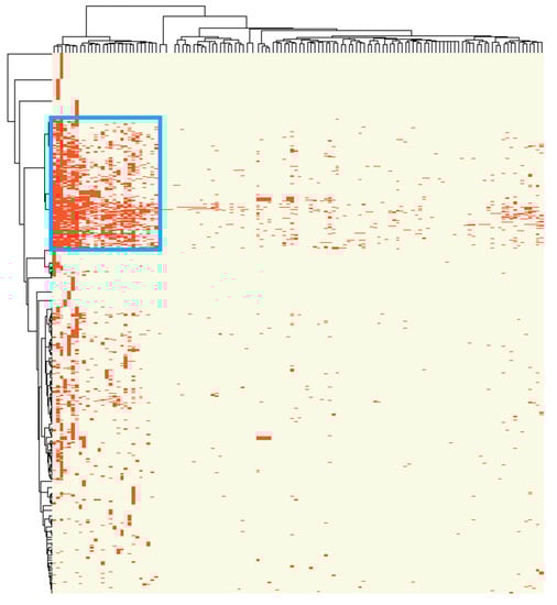 Clustering of miRNA-cancer associations. The clustering was based on the miRCancer database, with 947 miRNA and 131 tumors collected from published peer-reviewed scientific articles. The rows show miRNA and the columns show cancer types. The reported miRNA aberrations are shown in red. A significant cluster with 28 cancers and146 associated miRNAs is shown in a blue box.
