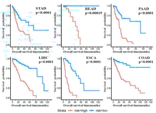 Kaplan–Meier curve of the prognostic value of miRNA signature in six digestive system cancers. Kaplan–Meier curves of high-risk and low-risk groups of patients from TCGA database in each cancer classified by prognostic models with identified miRNA signatures. All prognostic models in six cancers show significantly discriminative power between high-risk and low-risk groups.