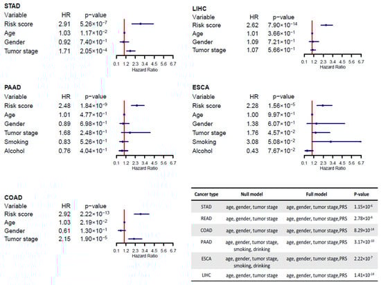 We also included the effects of covariates (age, gender and tumor stage) in the multivariate Cox proportional hazards regression models for all cancer types. Smoking history and alcohol history were also taken into the consideration in the analyses of PAAD and ESCA data. The estimated hazard ratios (HRs) and 95% confidence intervals (CIs) of PRS and covariates showed that PRS is the most significant prognostic factor compared with all other considered covariates (Figure 4, STAD: HR = 2.91; LIHC: HR = 2.62; PAAD: HR = 2.48; ESCA: HR = 2.28; COAD: HR = 2.92). Including PRS in the model with age, gender, tumor stage, smoking and alcohol history significantly improved the prognostic power (ANOVA test, STAD: p-value = 1.15 × 10−6, READ: p-value = 2.78 × 10−6; COAD: p-value = 8.29 × 10−14; LIHC: p-value = 1.41 × 10−14; PAAD: p-value = 2.58 × 10−9; ESCA: p-value = 2.42 × 10−7). Consistent with previous results, the covariate adjusted analyses also showed high discriminative power in Kaplan–Meier survival curves between the two groups in all six digestive system cancers (p-value < 0.05, Supplementary Figure S1).