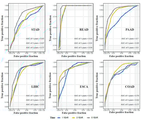 ROC curve of the prognostic value of miRNA signature in six digestive system cancers.