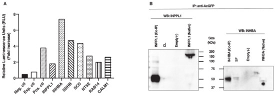 Further confirmation analyses were performed using co-immunoprecipitation (IP) followed by Western blotting using antibodies against INPPL1 and INHBA. These two partners were chosen based on the complementation assay results showing the weakest and strongest luminescence data for INPPL1 and INHBA, respectively. Following cotransfection of HEK cells with constructs of TRIB2 and either INPPL1 or INHBA, protein extracts were subjected to co-IP with anti-AcGFP antibodies followed by Western blot analyses with anti-INPPL1 or anti-INHBA. The results confirmed the presence of INPPL1 protein migrating at around 50 kDa in the sample subjected to co-IP while the protein extracts sample not subjected to co-IP showed the full size of INPPL1 migrating at around 160 kDa (Figure 1B, left panel). An additional band at around 100 kDa was also observed in the sample subjected to co-IP along with the 50 kDa band. This result suggests that INPPL1/SHIP2 could undergo cleavage to generate an active 50 kDa form from the 160 kDa form either prior or following interaction with TRIB2. A similar 51 kDa form of INPPL1/SHIP2 was previously reported and proposed to be the phosphorylated form of INPPL1 [20]. As expected, an empty vector used as negative control did not show any presence of INPPL1 protein expression (Figure 1B); however, the corpus luteum (CL) used as positive control did not show any INPPL1 protein presence either, although it was shown to express the strongest amount of INPPL1 mRNA. Likewise, INHBA was observed following Western blotting at around 50 kDa in the sample subjected to co-IP as well as in small follicle sample (SF) (Figure 1B, right panel). In the protein extracts sample not subjected to co-IP, INHBA was present at the expected size of 44 kDa, while the empty vector showed no INHBA protein (Figure 1B).