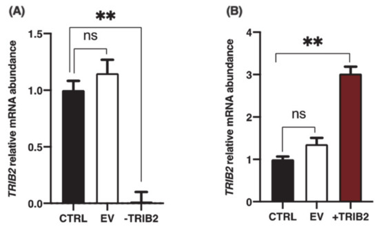 The Tribbles (TRIB) family of serine/threonine pseudokinases include TRIB1, TRIB2 and TRIB3, which represent atypical members of the serine/threonine kinase superfamily [1,2,3,4] and are homologues of the Drosophila pseudokinase “Tribbles” [5,6]. Pseudokinase proteins play critical nonenzymatic roles in the regulation of diverse cellular processes and have been associated with numerous key biological pathways [7]. Although they lack canonical phosphotransferase activity, pseudokinases play important roles as signal transduction mediators and protein scaffolds promoting degradation or stability of their target substrates. Instead of direct phosphorylation of target proteins, Tribbles interact with various signaling molecules and transcription factors and act as adaptors in signaling pathways for important cellular functions and neoplastic transformations [8,9]. Functionally, Tribbles pseudokinases share a PEST domain, which mediates protein degradation in the N-terminal region, a Trib domain that is homologous to protein serine/threonine kinases but lacks a catalytic function, a constitutive photomorphogenesis 1 (COP1) site allowing key proteins to be targeted to the proteasome for degradation, and a MAPK (mitogen-activated protein kinase)/ERK (extracellular signal-regulated kinase) Kinase 1 (MEK1) binding site that modulates MAPK activity [7,10]. The MEK1 and COP1 binding sites located at the C-terminal region facilitate, respectively, TRIB-mediated modulation of the MAPK/ERK signal transduction pathway through increased ERK phosphorylation, and proteasomal degradation by interacting with COP1 E3 ubiquitin ligase [7,11,12]. Tribbles family members can therefore modulate the ubiquitin–proteasome system, thereby stabilizing protein substrates as previously shown with TRIB3 [13]. Specifically, TRIB3 inhibits ubiquitylation and degradation of promyelocytic leukemia protein (PML) in acute promyelocytic leukemia progression by repressing proteasome recruitment and interaction with PML and by inhibiting the ubiquitin proteasome system activity [13]. As for TRIB2 in particular, it was also associated with ERK signaling pathway in ovarian granulosa cells as increased ERK1/2 phosphorylation was observed in TRIB2-overexpressed cells [14].