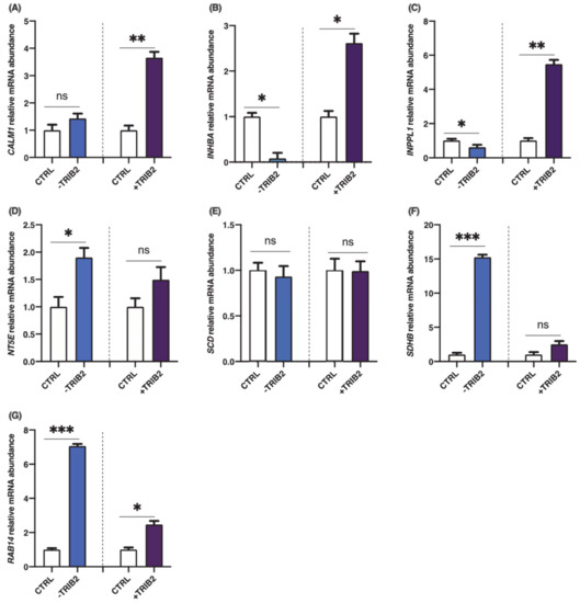 To investigate the effects of TRIB2 inhibition and overexpression on its binding partners, total RNA was extracted from cultured granulosa cells at day 6 following CRISPR/Cas9-induced inhibition or pQE-induced overexpression of TRIB2. Inhibition and overexpression of TRIB2 were confirmed by RT-qPCR. The results confirmed TRIB2 downregulation via CRISPR/Cas9 (Figure 3A; p < 0.01), while TRIB2 was overexpressed using the pQE system (Figure 3B; p < 0.01). These data confirming TRIB2 inhibition and overexpression in our model were previously published [14]. Subsequent analyses demonstrated that TRIB2 inhibition did not change CALM1 abundance while TRIB2 overexpression resulted in significant increase in CALM1 abundance (Figure 4A; p < 0.01). For INHBA (Figure 4B) and INPPL1 (Figure 4C), TRIB2 inhibition led to similar downregulation of their expression (p < 0.05). In contrast, TRIB2 overexpression resulted in increased expression of both INHBA (Figure 4B; p < 0.05) and INPPL1 (Figure 4C; p < 0.01) suggesting a strong TRIB2 modulatory role on these binding partners. TRIB2 inhibition had a positive effect on NT5E (Figure 4D; p < 0.05) and SDHB (Figure 4F; p < 0.001) expression; however, there was no significant effect of TRIB2 overexpression in NT5E and SDHB relative abundance. As for SCD (Figure 4E), there was no effect either way following TRIB2 inhibition and overexpression. Finally, RAB14 displayed a surprising result as both inhibition and overexpression of TRIB2 resulted in increased expression of RAB14 (Figure 4G).