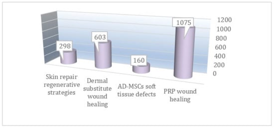 Of the 1075 articles, 197 using the keyword “PRP wound healing" were strictly focused on “PRP healing chronic wound”; 48 of the 160 articles related to “adipose-derived mesenchymal stem cells soft tissue defects” (bias n = 112) were strictly focused on AD-MSCs in wound healing; 109 of the 603 articles related to “dermal substitute wound healing” were strictly focused on “dermal substitute chronic wound healing”; and 68 of the 298 articles related to “skin repair regenerative strategies” (n = 298) were strictly focused on “skin repair regenerative strategies in vivo”.