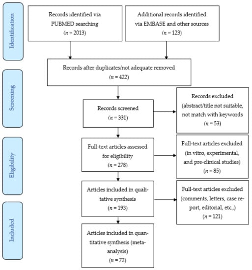 There were 278 articles that were initially assessed for eligibility; of this amount, 85 articles were excluded as pre-clinical, experimental, and in vitro studies. For the above-mentioned reasons, 193 articles were selected; of this amount, 121 articles were letters, expert opinion, commentary, and systematic reviews, and were removed. The 72 articles that strictly related to the use of RS based on AD-MSCs, PRP, and biomaterials in CSW and STDs were analyzed (Scheme 1).
