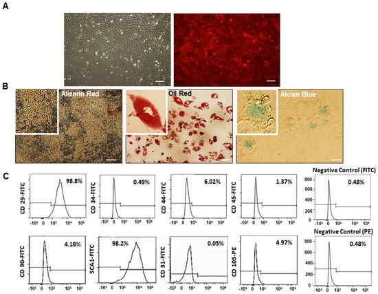 Characterization of bone marrow-derived mesenchymal stem cells (MSC) isolated from mTmG mice. (A) Plastic adherent cells were ex vivo expanded until passage 10, maintaining red fluorescent (RFP) expression throughout. (B) MSCs differentiated into osteogenic (alizarin red staining), adipogenic (oil red staining), and chondrogenic (alcian blue staining) lineages. Scale bars represent 200 µm. (C) Flow cytometry analysis for immunophenotyping showed that MSCs, in passages 7–8, were positive for CD 29 (98.8%), SCA-1 (98.2%), CD 44 (6.02%), CD 90 (4.18%), and CD 105 (4.97%), and negative for CD34 (0.49%), CD 45 (1.37%), and CD 31 (0.05%).