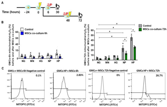 To examine the anti-oxidative potential of MSC treatment on GMCs, we assessed the mitochondrial ROS accumulation after growing these cells with NP and HP media. In Figure 3A, we described the schemes of these cellular experiments with co-culture. Importantly, MSC co-culture, as a 24 h-treatment, was able to inhibit the H2O2 mitochondrial accumulation after 72 h conditioning, evidencing a notable anti-oxidative capacity (p < 0.05) (Figure 3B,C).