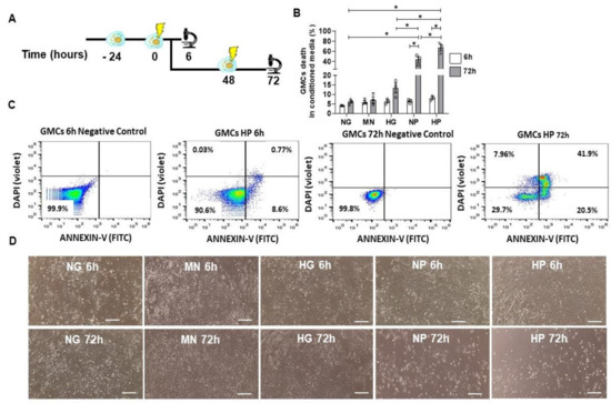 GMCs’ death induction after stress-conditioning at different time points. (A) Scheme of GMCs’ experiments for stress-conditioning at different time-points (6 h and 72 h). (B) Flow cytometry analysis of GMCs’ death after stress-media conditioning. NP and HP media caused an increase in cell death, in comparison to 6 h conditioning (* p < 0.05). (C) Flow cytometry gating and negative control for GMCs conditioned to HP media at 6 h and 72 h. (D) Light microscopy imaging of GMCs conditioned at 6 h and 72 h. NP and HP caused a visual morphology alteration, disturbing cell growth and culture plate occupancy after 72 h conditioning. Scale bars represent 200 µm. Cell death (Annexin-V+ and DAPI+) in GMCs conditioned to stress media (normal glucose—NG, mannitol—MN, hyper glucose—HG, normal glucose + hydrogen peroxide—NP, hyper glucose + hydrogen peroxide—HP) during 6 h and 72 h time-points. Error bars represent mean ± SEM; n = 3.