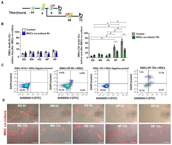 To verify the anti-cell death potential of MSC treatment on GMCs, we assessed the apoptosis (Annexin) and early necrosis (DAPI) after growing these cells with NP and HP media. In Figure 5A, we described the schemes of these cellular experiments with co-culture. Importantly, MSC co-culture, as a 72 h-treatment, was able to decrease cell death in NP and HP media (p < 0.05) (Figure 5B–D), highlighting notable therapeutic potential of MSCs.