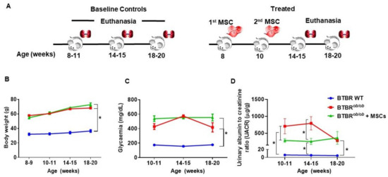 Metabolic and renal functional parameters in BTBRob/ob control and MSC-treated BTBRob/ob mice. (A) Schemes of the procedure. Blood and urine samples were collected at three time-points in accordance to animal age (8–11, 14–15, and 18–20 weeks old) for both BTBRob/ob control group and MSC-treated BTBRob/ob group. MSCs were injected in the 8th and 10th weeks of age and euthanasia was performed in the 18th–20th weeks of age. (B) Body weight gain in BTBRob/ob was not prevented by MSC treatment (p > 0.05). (C) Glycemia after 6 h-starvation did not decrease after MSC treatment (p > 0.05). (D) Urine-albumin-to-creatinine ratio (UACR) was significantly diminished in MSC-treated BTBRob/ob mice in the 14th week of age when compared to BTBRob/ob control mice (* p < 0.05). Error bars represent mean ± SEM; n = 6 animals.