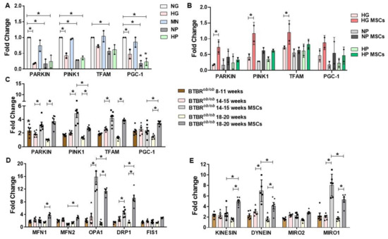 RNA expression of mitochondria quality control program (MQCP)-related genes in GMCs and in BTBRob/ob mice’s kidney cortexes. (A) GMCs cultured in stress-conditioning media (HG, NP, and HP) presented a down-regulation in PARKIN and PINK1 gene expression at 72 h, whereas PGC-1 expression was only inhibited in NP and HP at 72 h (* p < 0.05). (B) MSCs treatment recovered PARKIN, PINK1, and TFAM gene expression in GMCs after HG 72 h-conditioning (* p < 0.05). (C) PARKIN, PINK1, TFAM, and PGC-1 genes had decreased expression in 14–15 and 18–20 week-old BTBRob/ob mice kidney cortexes in comparison to 10–11 week-old mice. MSC treatment at 14–15 and 18–20 weeks of age upregulated PARKIN, PINK1, and TFAM (p < 0.05). PGC-1 was upregulated only in MSC-treated 18–20 week-old mice (* p < 0.05). (D) DRP1 and OPA1 had increased gene expression in 14–15 and 18–20 week-old MSC-treated BTBRob/ob mice kidney cortexes (p < 0.05). MFN1 only had increased gene expression in 18–20 week-old MSC-treated BTBRob/ob mice kidney cortexes (p < 0.05). (E) DYNEIN and MIRO1 had increased gene expression in 14–15 and 18–20 week-old MSC-treated BTBRob/ob mice kidney cortexes (* p < 0.05). KINESIN had only increased gene expression in 18–20 week-old MSC-treated BTBRob/ob mice (* p < 0.05). Our qRT PCR results (2ΔΔCt) were normalized to BTBR wild-type mice at each related age (10–11, 14–15, and 18–20 week-old). Error bars represent mean ± SEM. For GMCs qRT PCR assays, n = 2. For BTBR mice qRT PCR assays, n = 6.