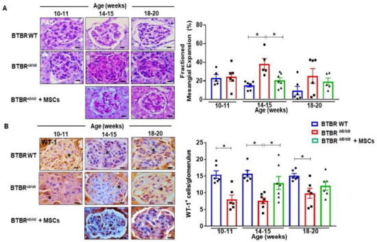 MSCs preserve BTBRob/ob kidneys from mesangial expansion and podocyte loss. (A) DKD promoted increased matrix deposition in mesangial compartment of BTBRob/ob mice at 14–15 weeks of age (* p < 0.05). MSC treatment curtailed mesangial expansion when 14–15 week-old MSC-treated BTBRob/ob mice were compared to 14–15 week-old BTBRob/ob mice (* p < 0.05). (B) Number of podocytes per glomerulus, verified by the immunohistochemistry staining for WT-1 protein, decreased as DKD progressed in BTBRob/ob mice when compared to BTBR WT (p < 0.05). MSC treatment showed a protective effect as podocyte maintenance leading to a higher number of WT-1+ cells in 14–15 week old MSC-treated BTBRob/ob mice in comparison to 14–15 week old BTBRob/ob mice (* p < 0.05). BTBR WT was not statistically different at 18–20 weeks. (*) indicates WT1+ cell. Scale bars represent 10 µm in (A and B). Error bars represent mean ± SEM. For periodic acid-Schiff (PAS) and WT-1 staining: n = 5–7 animals.