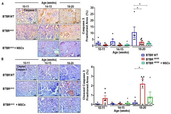 To test whether the beneficial outcome of MSCs was also attributed to a decrease in apoptotic cell death, we verified the caspase 3 signaling pathway in kidney cortex sections of BTBRob/ob and BTBR wild type mice. Despite caspase 3 induction in 20 week-old BTBR WT mice, when compared to BTBRob/ob (p < 0.05) (Figure 9A), active cleaved-caspase 3 was up-regulated as DKD progressed in BTBRob/ob mice (Figure 9B), indicating activation of this cell death signaling pathway. Therefore, MSC therapy led to a potential decrease in cleaved-caspase 3 expression in 20 week-old BTBRob/ob mice (Figure 9B).