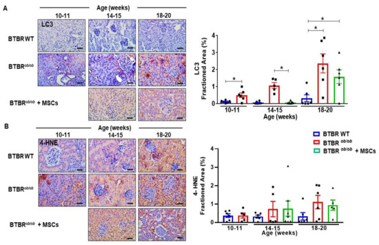 Next, we investigated autophagy signaling pathways during DKD progression. Autophagy marker microtubule-associated protein light chain 3 (LC3) is used to assess autophagy activity and has two isoforms. LC3-I is converted to LC3-II and then to autophagic vesicle. To note, BTBRob/ob mice had increased LC3 protein expression in kidney sections by 20 weeks of age (p < 0.05), indicating that autophagy increased over time (Figure 10A). We pursued further investigation of LC3 expression in MSC-treated BTBRob/ob mice and found lower LC3 expression values in 14–15 week-old treated mice (p < 0.05), pointing out a temporary protective effect on suppressing the superlative time-dependent autophagy induction in consequence of DKD progression in these animals, as this effect did not persist until 18–20 weeks of age (Figure 10A). BTBRob/ob mice had higher LC3 expression in comparison to BTBR WT mice at every age evaluated (p < 0.05).