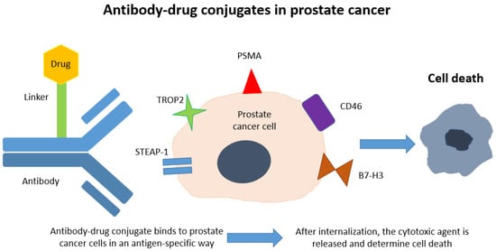 ADCs can specifically identify overexpressed antigens on cancer cells, release anticancer drugs and selectively kill tumor cells. However, many antigens are also present on normal cells, thus diverting the targeting molecules to cancer cells. The research for the best candidate for ADC therapy in prostate cancer has led to a series of studies in which STEAP, TROP2, PSMA, CD46 and B7-H3 are the main actors.