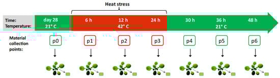 Scheme of the experiment. Samples of Arabidopsis thaliana were collected in seven time points: Under control conditions (marked as p0), during heat stress (p1, p2, p3), and after returning to the control conditions (p4, p5, p6) with three replicates for each time point.