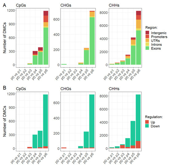 Differentially methylated cytosines in CpGs, CHGs, and CHHs in subsequent time points in comparison to control sample depending on genomic region (A) and direction of change (B).