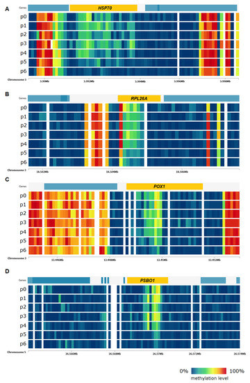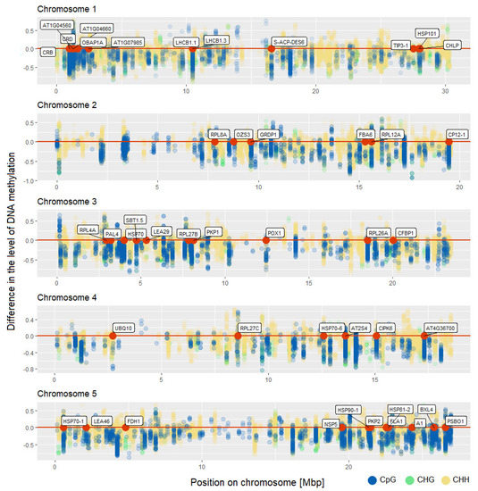 Another group of genes are those related to abscisic acid (ABA), which is a major phytohormone that plays an essential part in acting toward varied range of stresses [37] like heavy metal stress, drought, thermal or heat stress, high level of salinity, low temperature, and radiation stress. This category includes genes like GRDP1. As heat stress induces oxidative damage in plants [38], among differentially methylated genes there are also those associated with oxidation-reduction process and response to oxidative stress like FDH1 and PSBO1. Important group of genes are also those related to translation. Studies showed that regulation of translation elongation represents a major component of cellular stress responses [31]. Among these genes, RPL26A and RPL12A can be mentioned. Visualization of changes in DNA methylation level of selected stress-related genes under the influence of heat stress is presented in Figure 9.