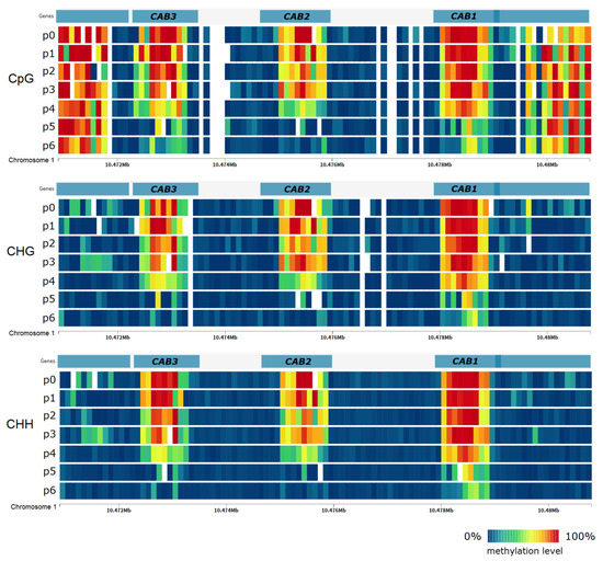 DNA methylation level in Arabidopsis thaliana genes encoding chlorophyll a-b binding proteins (CAB1, CAB2, CAB3) under heat stress in the subsequent time points of the experiment. DNA methylation level does not change significantly during heat stress (p1–p3) but decreases after transfer to normal conditions (p4–p6).
