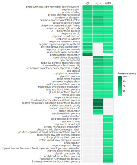 To check whether identified changes in DNA methylation pattern are stress-specific and emerged under the influence of heat stress treatment, we conducted ontology enrichment analysis of differentially methylated genes. Due to the fact that we have identified very few genes that methylation level increased under heat stress and those that react at the initial stages of the experiment, we took into account all genes that methylation profile changed under the influence of stress. We conducted the analysis separately for genes with differences in CpGs, CHGs and CHHs (Figure 6). Results with a significance of p < 0.05 after false discovery rate correction were taken to be significant. Our analysis indicated that overrepresented features are mainly related to the stress response, especially those that are common to genes with changed methylation profile in all three sequence contexts. Among these features we can mention those associated with protein refolding which is a process strictly related to the response to heat stress and regulated by heat-shock proteins. Other interesting overrepresented features is translational elongation that is a process highly affected by heat stress according to literature [31]. We also observe many overrepresented features related to response to various stimuli like osmotic stress, heat, cold, metal ion, and high light intensity. Another overrepresented feature is seed maturation, which may be explained by the fact that many genes involved in seed maturation are also responsible for stress response like for example genes belonging to LATE EMBRYOGENESIS ABUNDANT (LEA) family [32] or genes associated with abscisic acid [33]. The results suggest that very specific genes related with stress response are subjected to DNA methylation changes under high temperature treatment. However, we have observed that genes in which changes in DNA methylation level have only occurred in the CHG or CHH context but not in CpG are less related to the heat stress response, suggesting that the changes in methylation level in this sequence contexts are less specific.