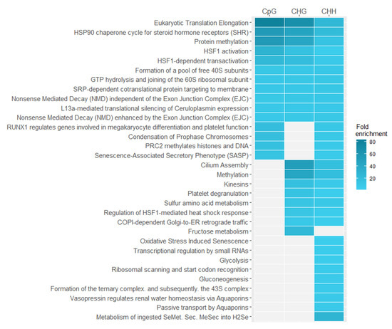 We did similar analysis on Reactome pathways data [34] to identify pathways in which differentially methylated genes are involved (Figure 7). Using enrichment analysis, we found overrepresented pathways in different sequence contexts. Results with a significance of p < 0.05 after false discovery rate correction were taken to be significant. As in the case of gene ontology enrichment analysis, we observe that overrepresented features, which are common to all sequence contexts, are the most specific and related to the response to stress especially to action of heat shock proteins (HSP), translation elongation, and nonsense mediated decay (NMD), which serves as a major regulator of the unfolded protein response pathway [35].
